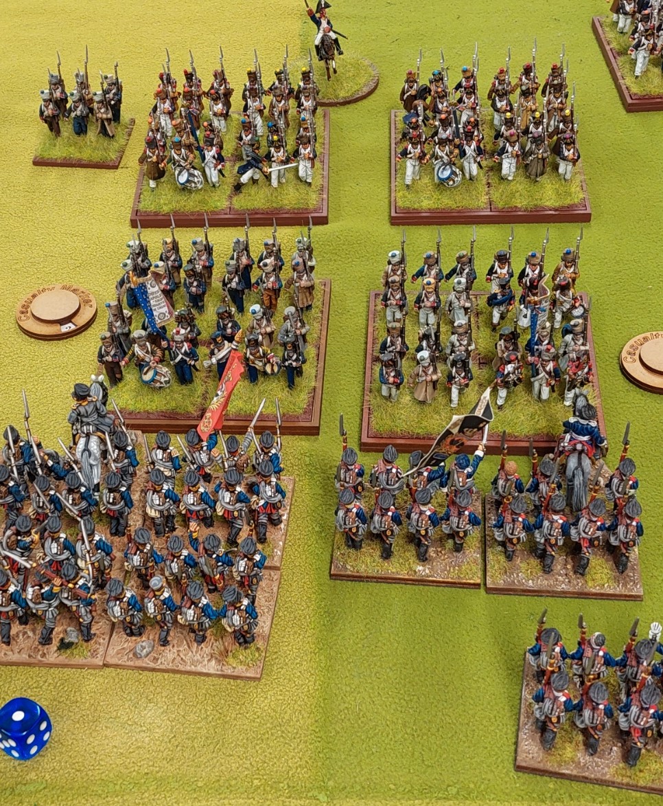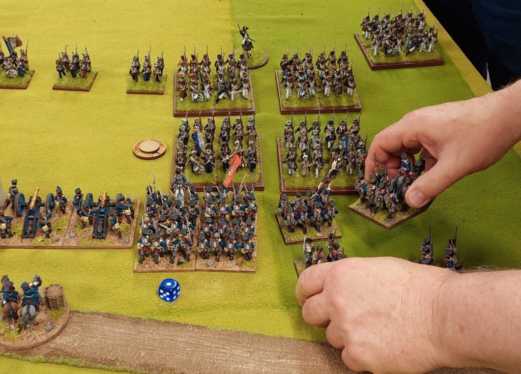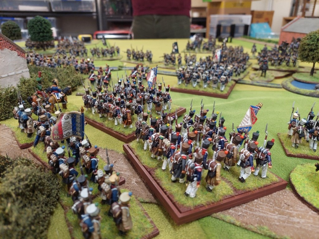 The French started with 2 Divisions on the table, both of 2 brigades. There were meant to be 2 cavalry brigade’s also on the table…but the reduction in table width resulted in not enough space to deploy them.