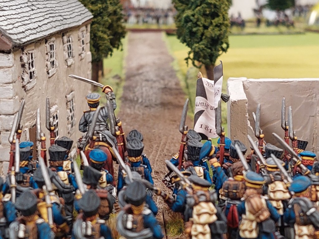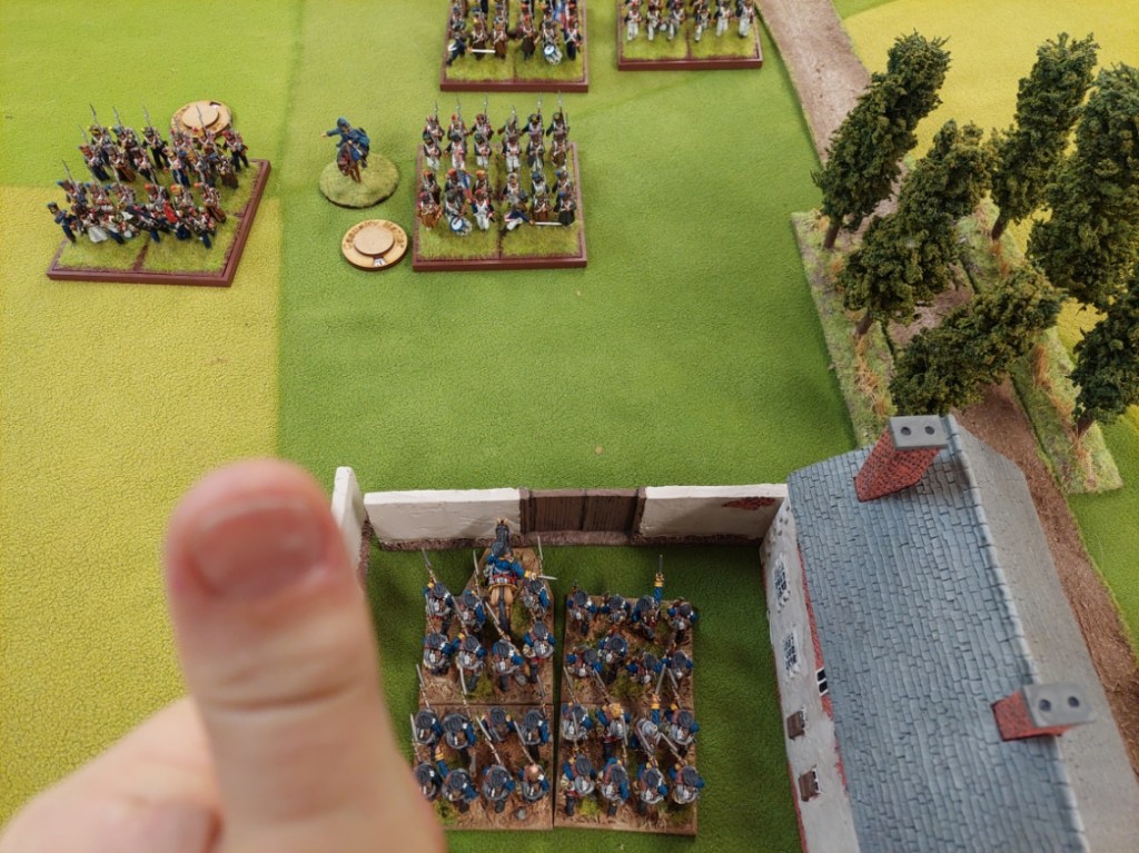 Graham launched attack on the landwehr in the farmhouse. It didn’t go well…after several rounds of combat the French popped. Some ones thumb got in the picture.