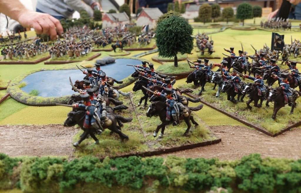 Other side of table…..I was holding the village…well….actually just being target practice. Shooting is vicious,,,,,you get 3 shots…..on a 4 you cause a casualty…no save…in a village…you ignore the FIRST casualty.. the rest stick…so if you put a unit in a village…and opponent gets several units and a battery to shoot you…you don’t survive long at those odds!! Now opposite these Prussian landwehr is my Cuirassier brigade. Plan was to charge to landwehr and form them into square. This is where reading rules would have helped…..I have 7 attacks….Landwehr have 5 as in attack columns…however….there is no form square test…instead my attacks round down to 50%…so I have 3 attacks…..YIKES!!