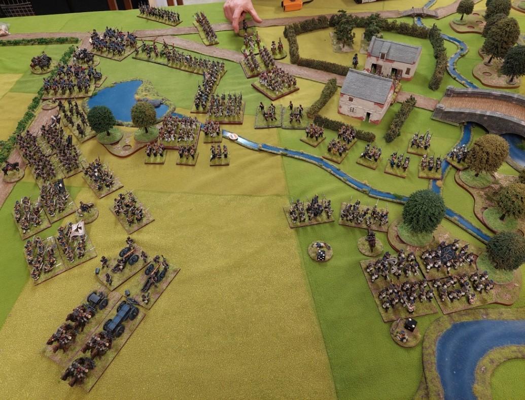 View from Reg’s position with Dutch holding centre and Hanoverians moving up to the left flank. Robert has a bit of a bloodied nose but has given as good as he got. My 3 bttns of Legere are moving up in skirmish supported by columns. My 2nd brigade was having trouble crossing the stream and lagged behind.