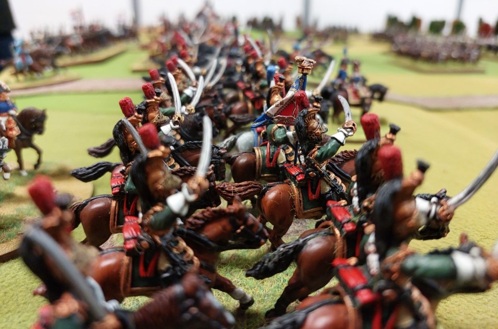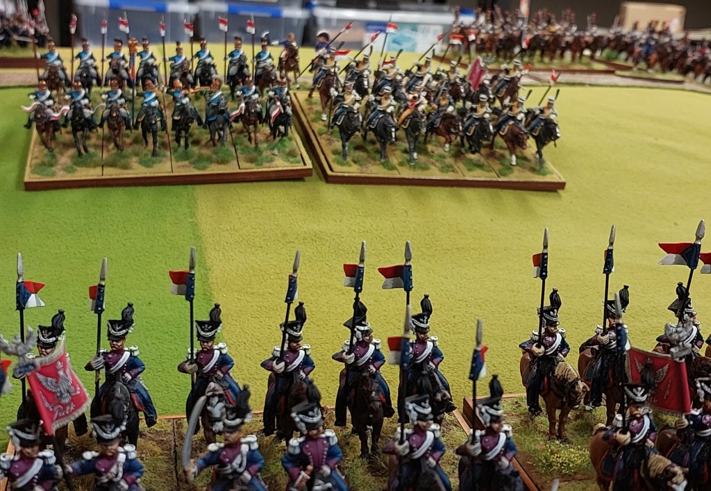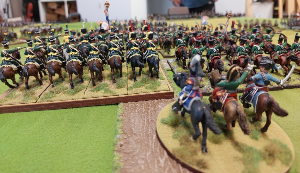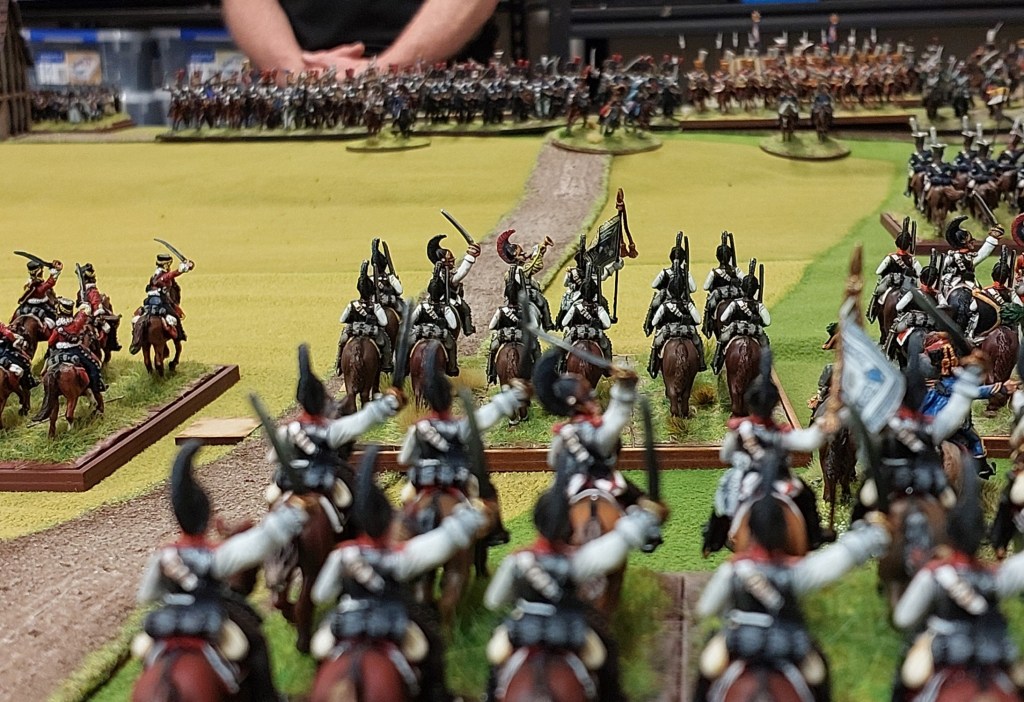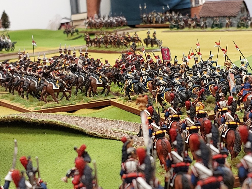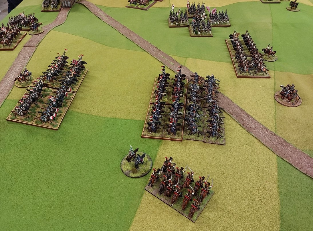 Now Steve had moved the Russian Guard Light Cavalry up to support his Cuirassier thrust through the middle…..so Robert sent Polish Uhlans into an exposed FLANK….. Rob then sent Cuirassiers into the front…..and Robert sent my Cuirassiers over there in case needed as well.
