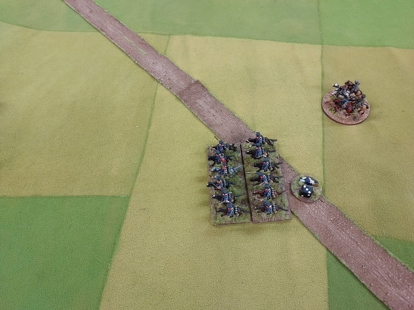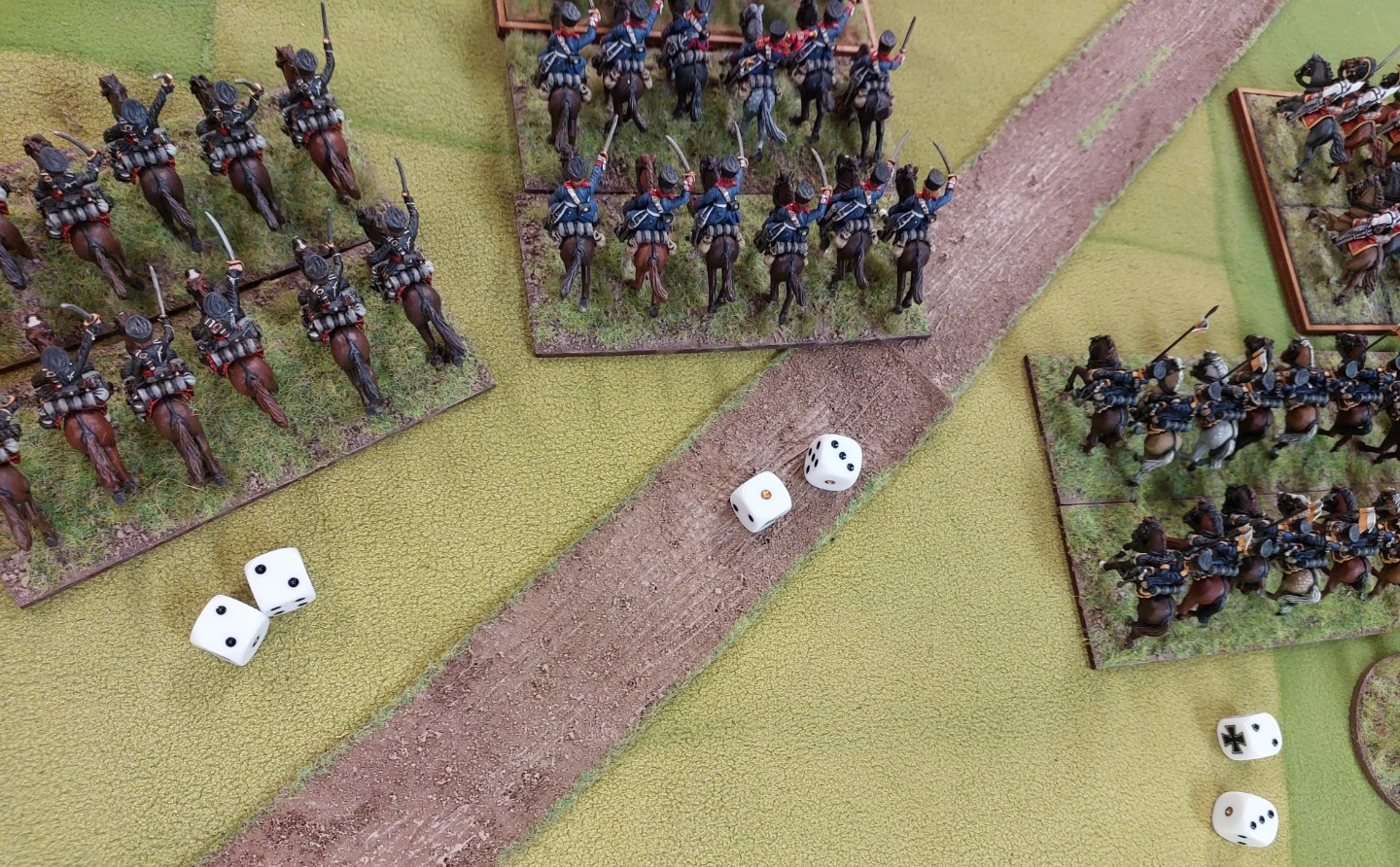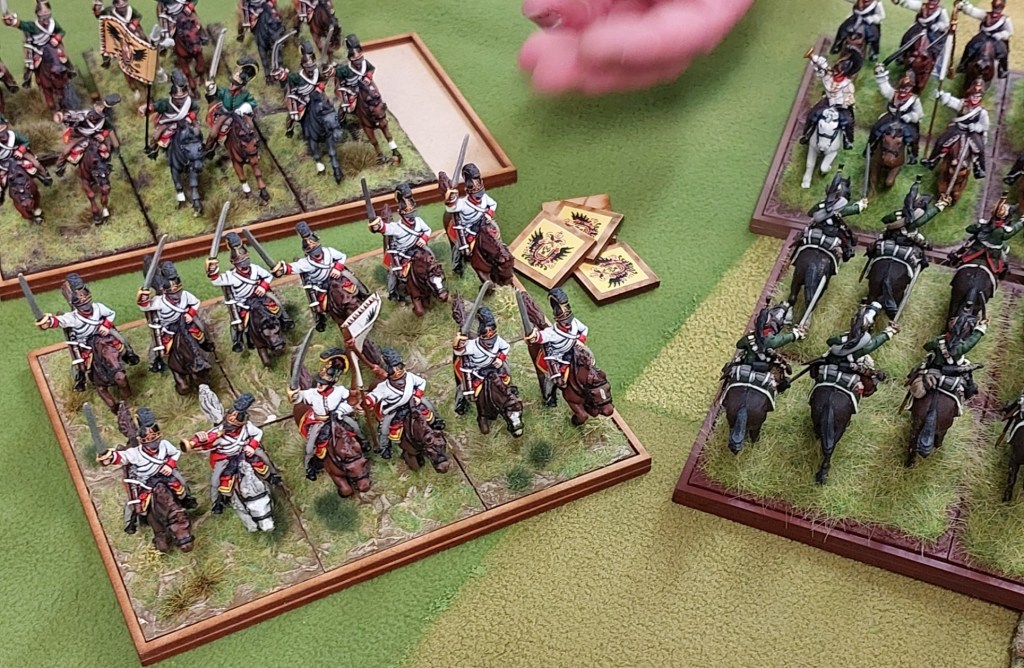 Combat was…interesting…Robert charged…Goldie countered…..Prussian Dragoons beat Uhlans who popped…Empress Dragoons then decided to withdraw off table…..then the other Polish Uhlans beat up the Prussian Uhlans…who decided to be elsewhere (Goldie’s hand is a giveaway).