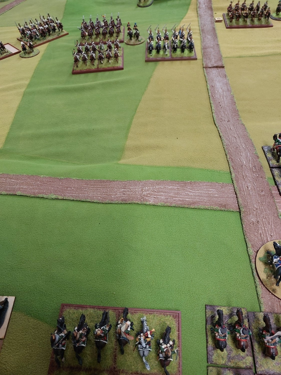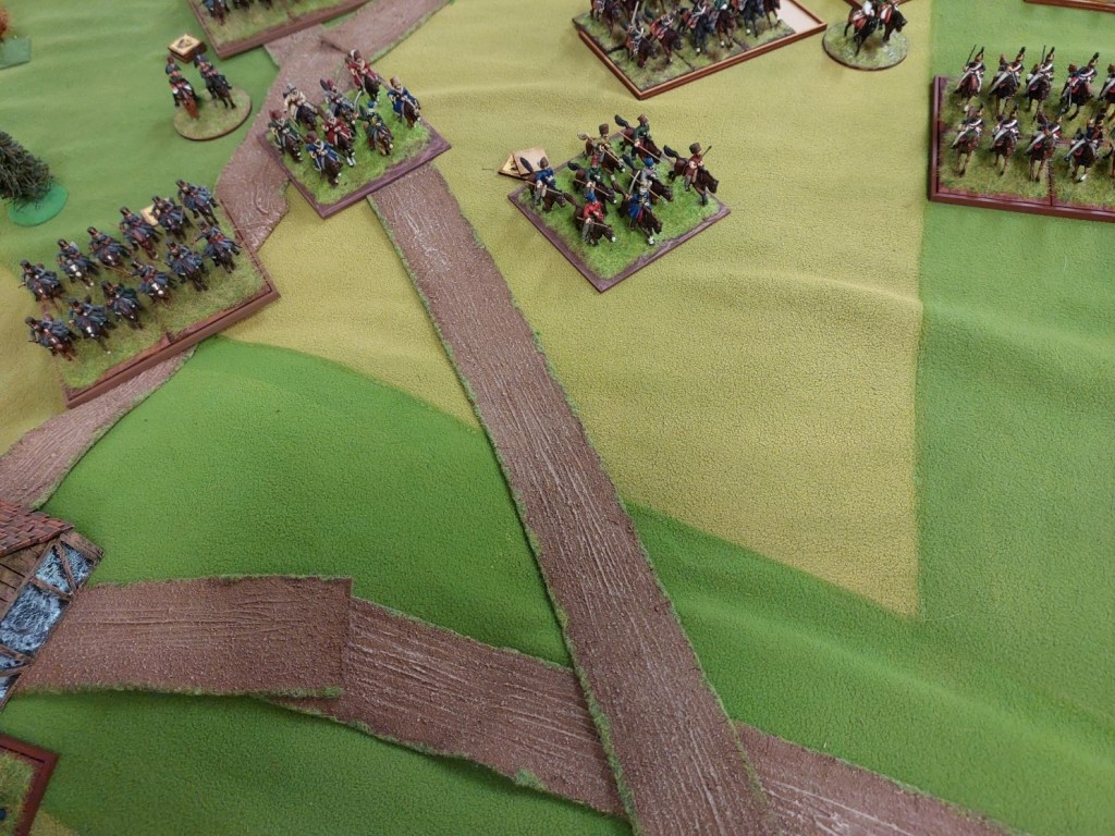 Dutch Militia at right angles…..there was a French bttn there a moment ago. On other side of road French and British have been at it…….light cavalry from both sides moving up.
