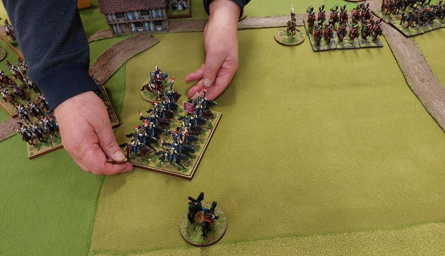 So below we have French infantry brigade on the left v Prussian infantry and a French Cuirassier brigade on v Prussian Cavalry. In the infantry fight the French have advantage as have a flanking unit and a rear unit…they add differing attack factors. Now the Cavalry bash is very interesting….. the Dragoons get 6 attacks….the support adds 3 as is touching corner of French Cuirassiers…the Cuirassiers get 7 attacks…but only 1 for the supporting unit…Prussians roll average…French less than average and they explode(several tests are performed).