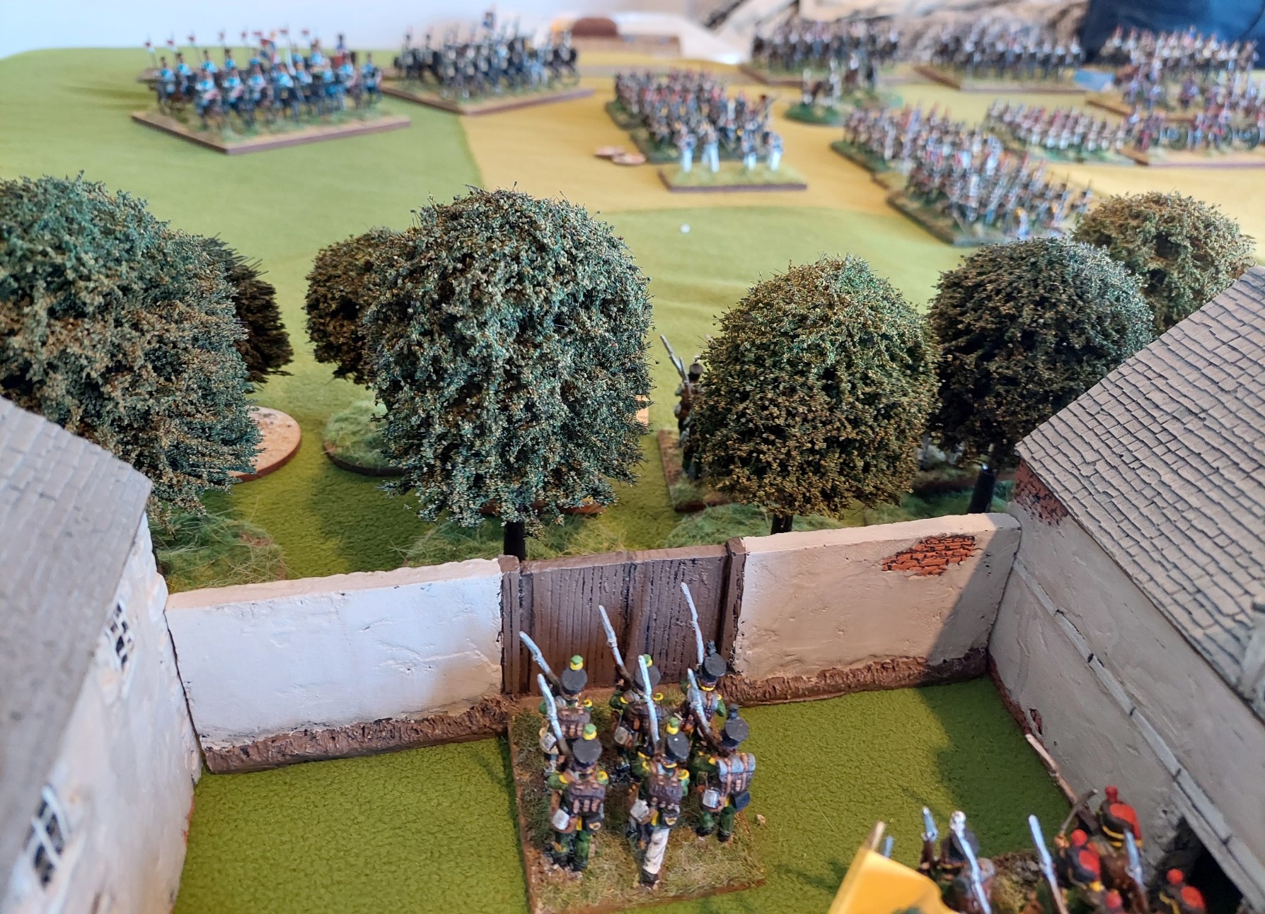 View down central road….Alan’s buildings look great…..the fences/walls meant -1 to hit from shooting at units behind them….fields limited visibility.
