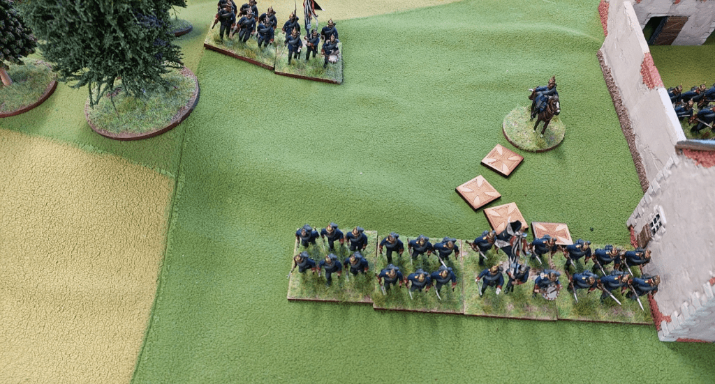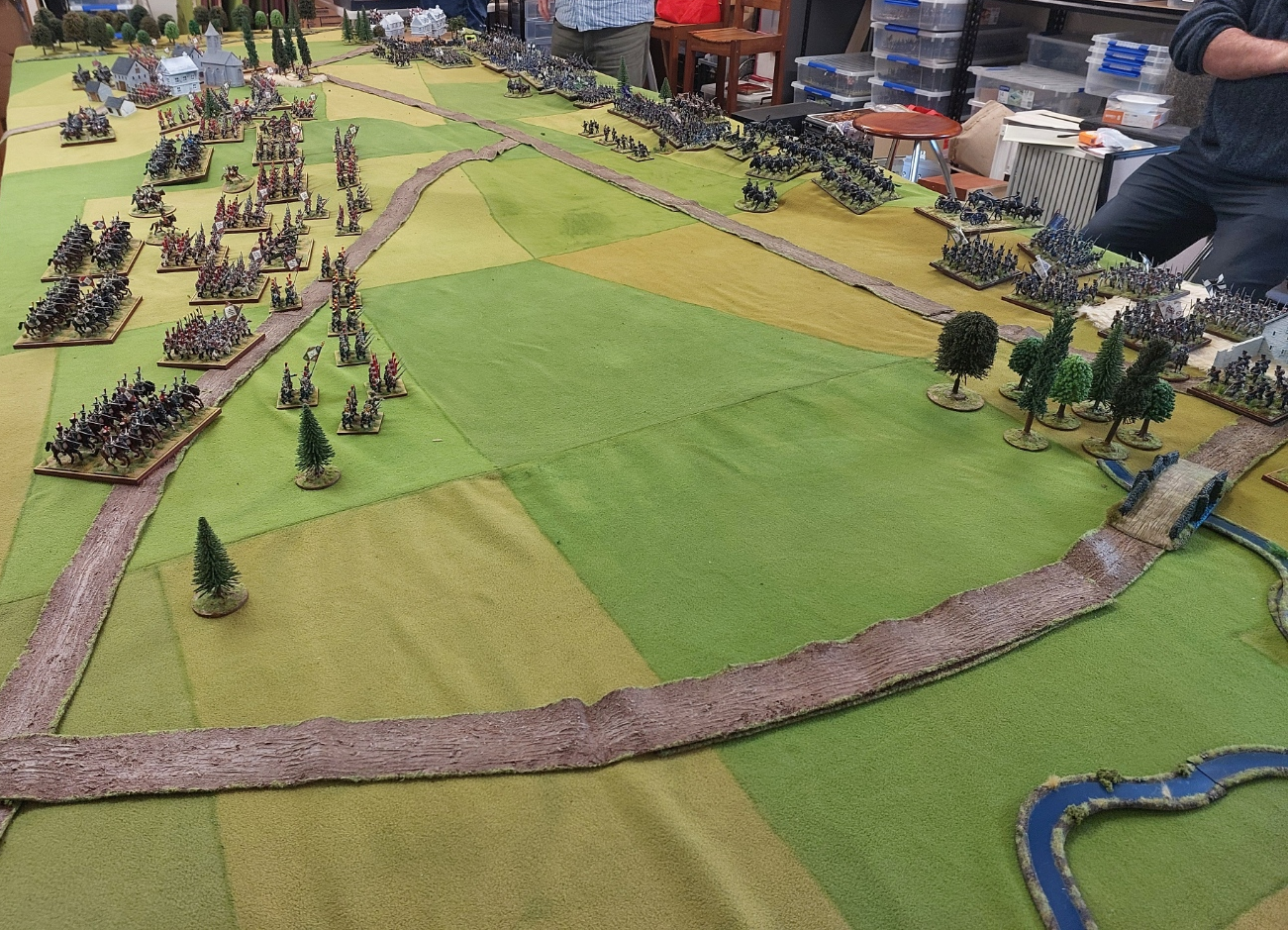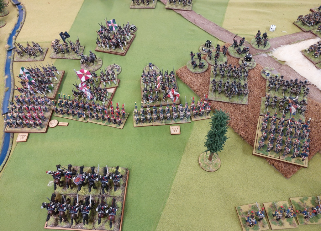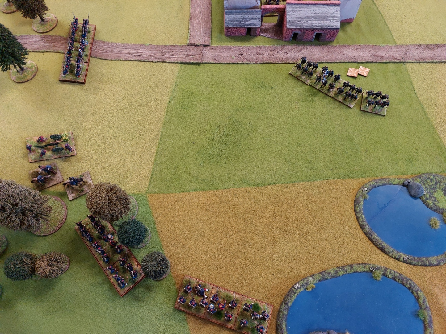 Prussians have turn 1. Steve’s brigade order left his landwehr behind and as crossing the stream would have disordered his cavalry, they moved across and behind the infantry.