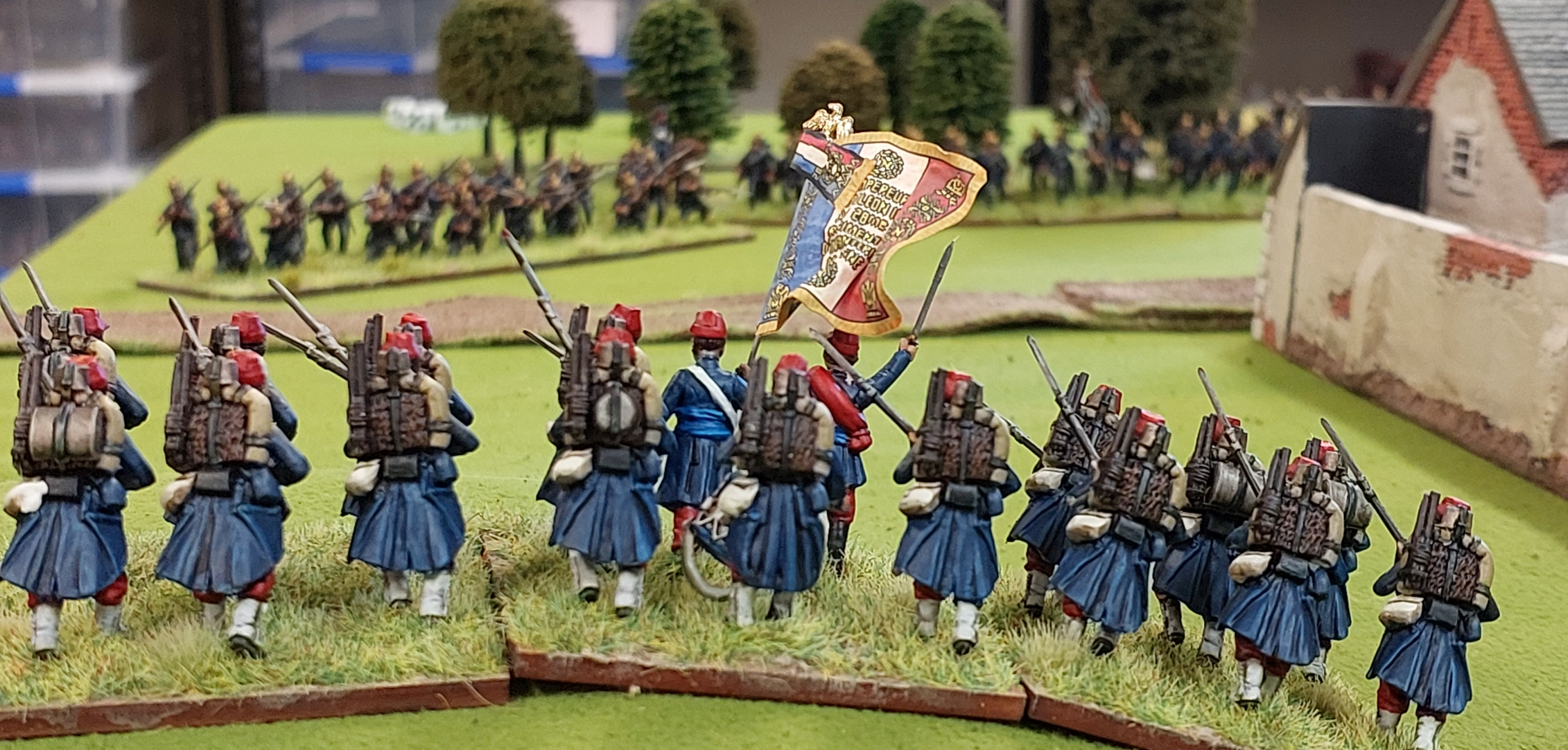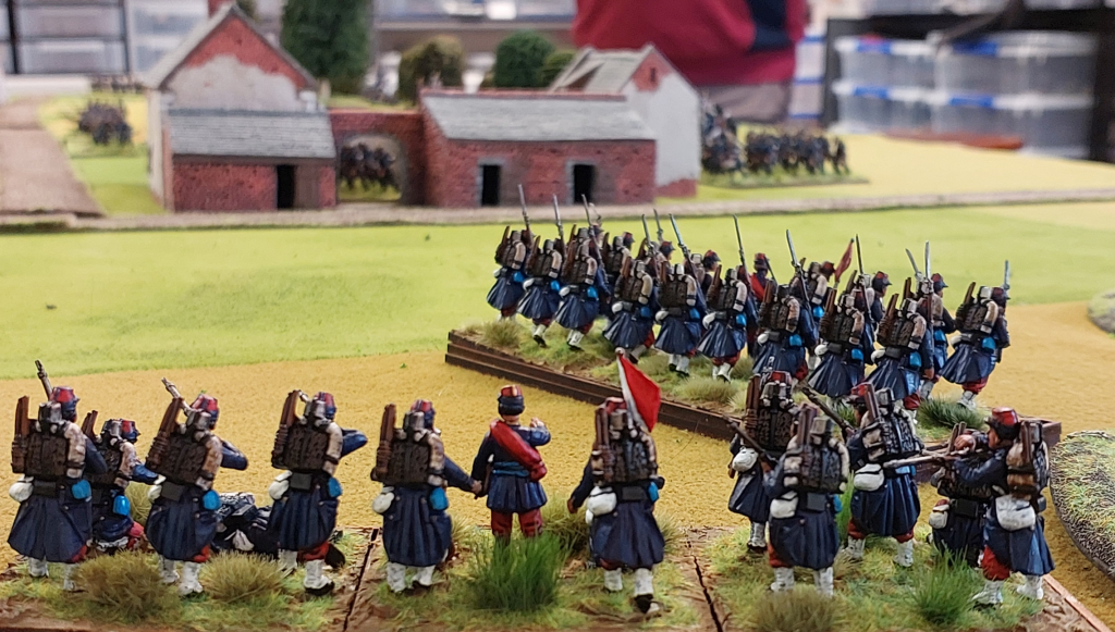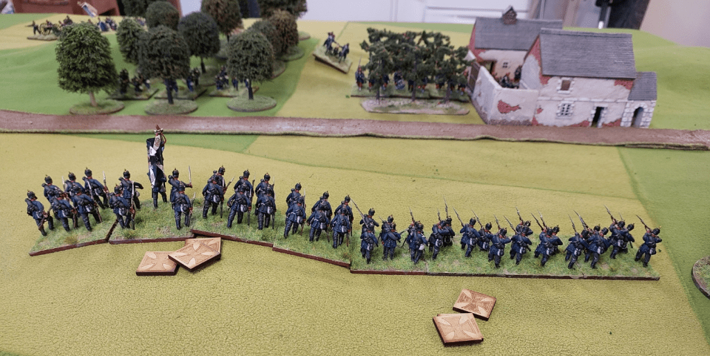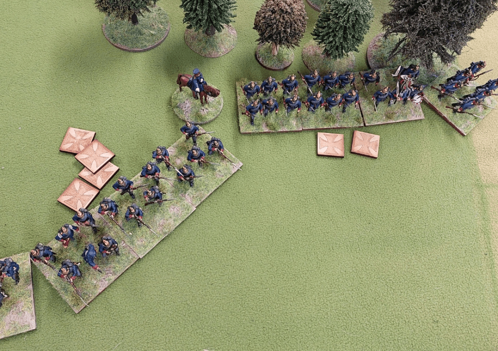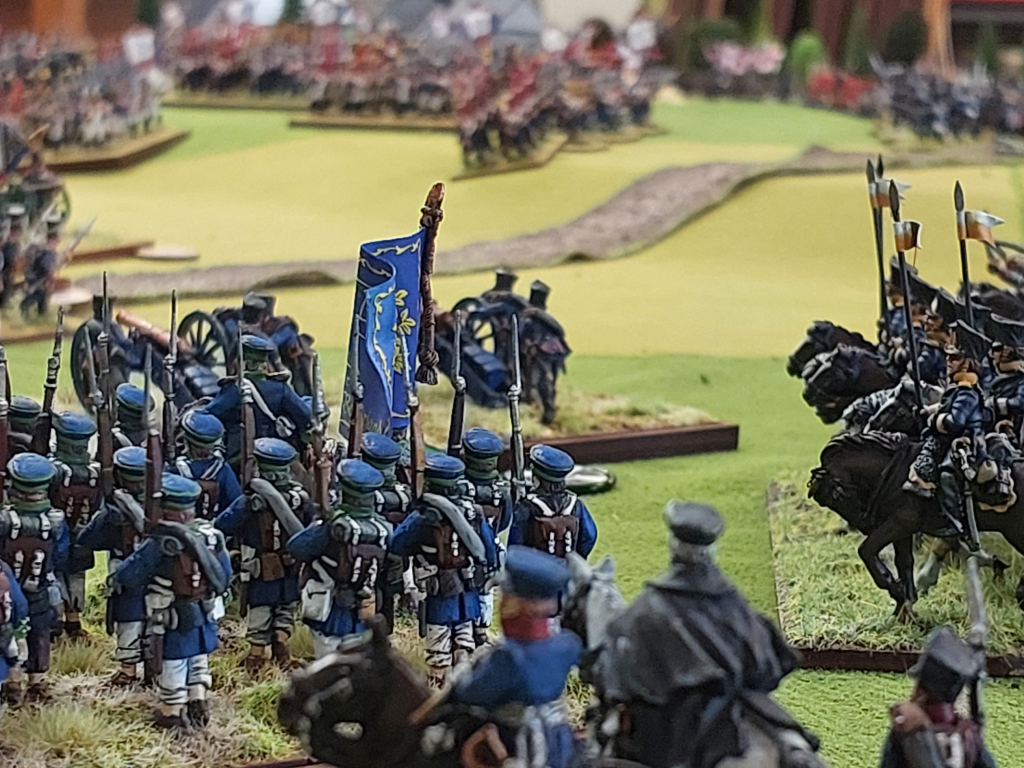 Prussians have turn 1. Steve’s brigade order left his landwehr behind and as crossing the stream would have disordered his cavalry, they moved across and behind the infantry.