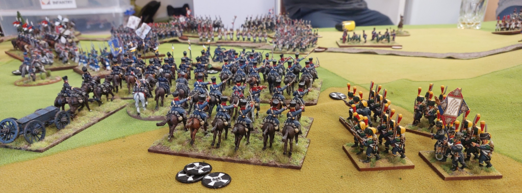Which left me facing the Prussian reserve cavalry. Oh well, I got one glorious charge in! They were charged, got beaten up….retired….got beaten up….retired….I then initiative moved them off the table..shaken/disordered and flank on to Prussians…a target ready for destruction…and tests for the troops around them…so…they REALLY HAD TO GET OFF TABLE!