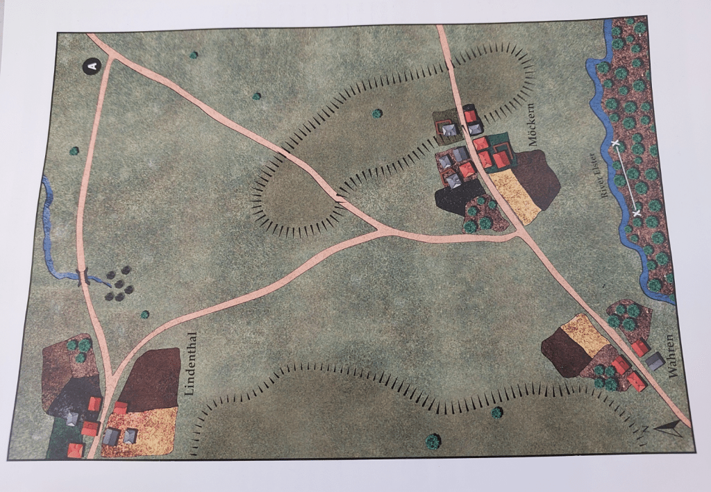 The French could deploy up to 6inches in front of Mocken and extend from the River Ekster to the bridge over the stream. The Prussians may deploy between the villages of Wahren and Lindenthal. Mockern was a 3 module village, the others were 1 module.